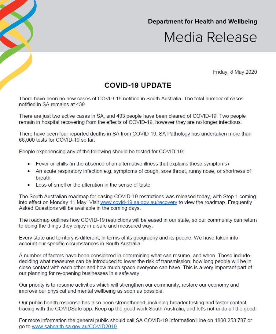 Uzivatel Sa Health Na Twitteru South Australian Covid 19 Update 9 05 20 For More Information Go To Https T Co Mynzsgpayo Or Contact The South Australian Covid 19 Information Line On 1800 253 787 Https T Co Cjjgw9vyuc